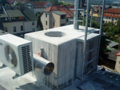 Herstellen einer Kernbohrung in einem ehem. Schornstein, Durchmesser 530mm und einer Bohrtiefe von über 1200mm. Hierbei musste ein einbetoniertes KG-Rohr DN 300 aufgebohrt werden. Das Gebäude war in Betrieb während des Umbaus